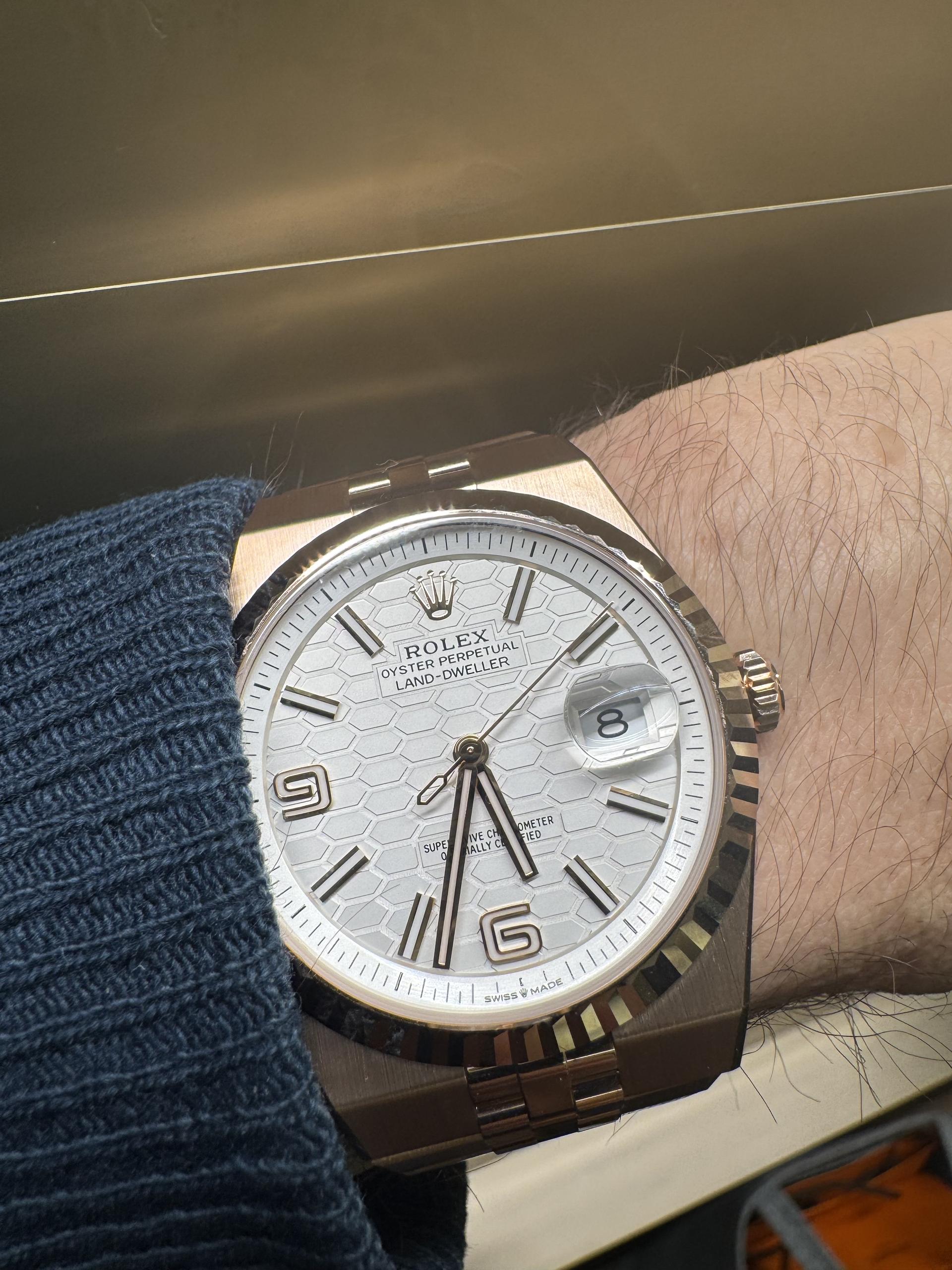 The Land-Dweller sits somewhere between the Datejust and the Day-Date lines, features an integrated bracelet and case reminiscent of its Oysterquartz models that came out in the 1970s, and has a honeycomb texture on its dial. It’s quite nice! |