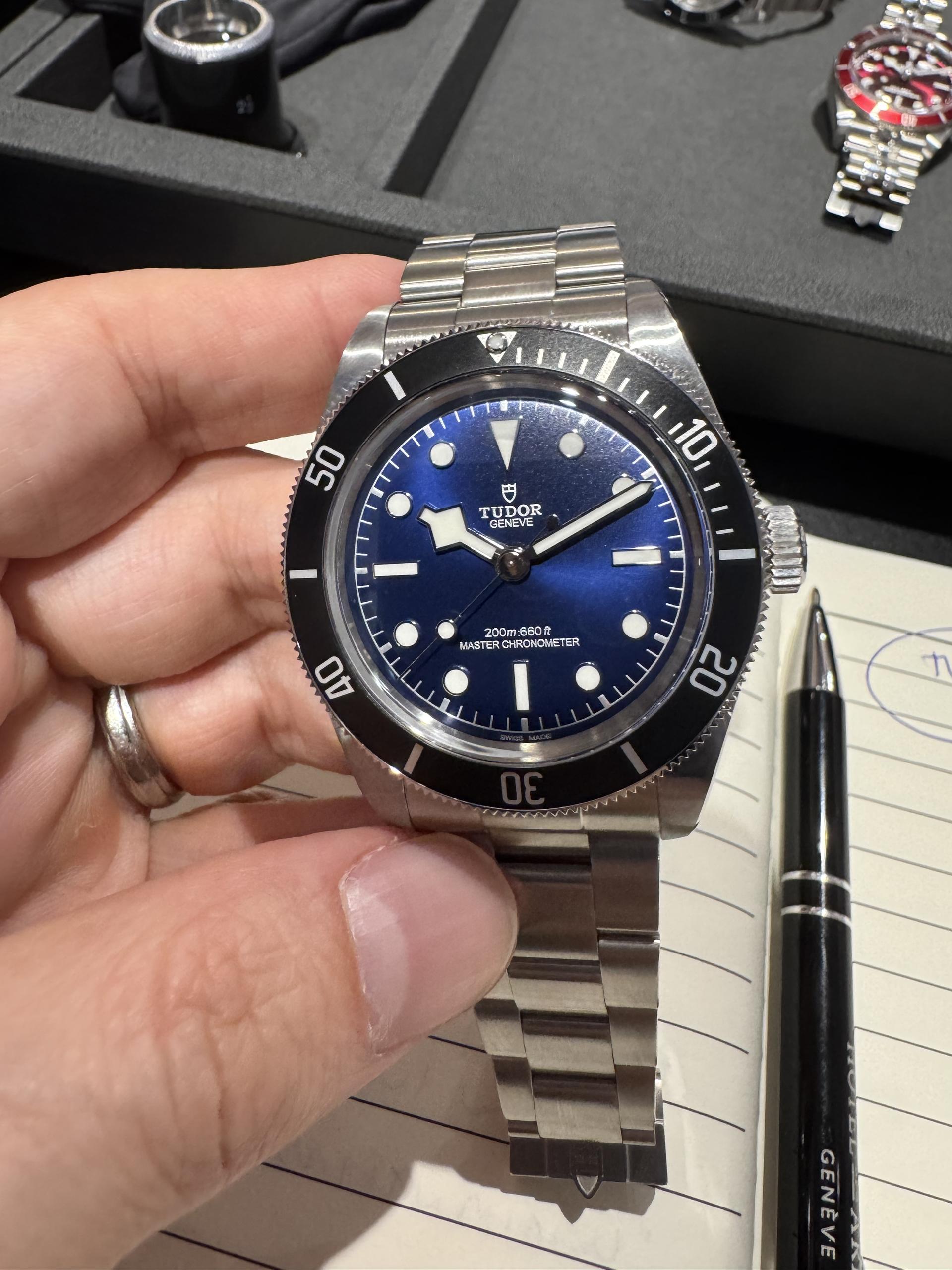 There’s the Black Bay 58 which is 39mm in diameter, the Black Bay 54 which is 37mm in diameter and the Black Bay Chrono which is 41mm in diameter. There are also six different watches called the Black Bay S&G and five more simply called the Black Bay, plus the Black Bay Ceramic, all of which measure 41mm in diameter. Now comes a new line, the Black Bay 68 – which measures 43mm, though at this stage is anyone still counting? Apart from the new size, this one comes in two dial colours (sun-brushed silver or “Tudor blue”), a new bracelet and with a movement that’s now both COSC and MATAS certified for accuracy.
