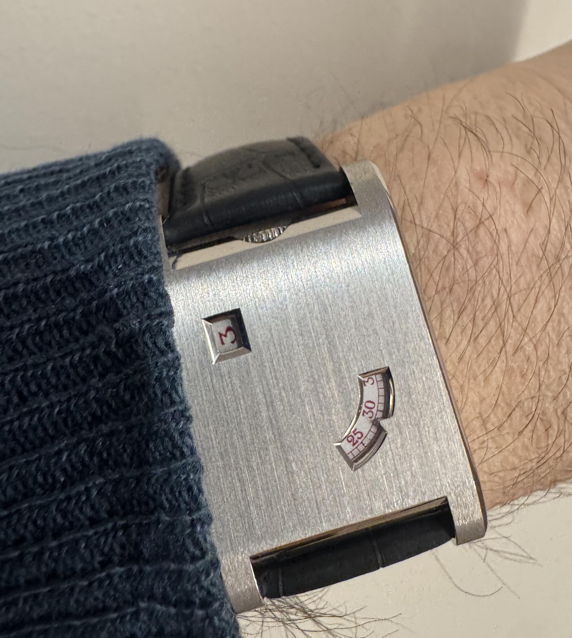 There’ll also be a fourth version, the platinum model on my wrist in the photo above, which has a unique layout, with the guichets turned on their sides. This one is a limited edition of 200. |